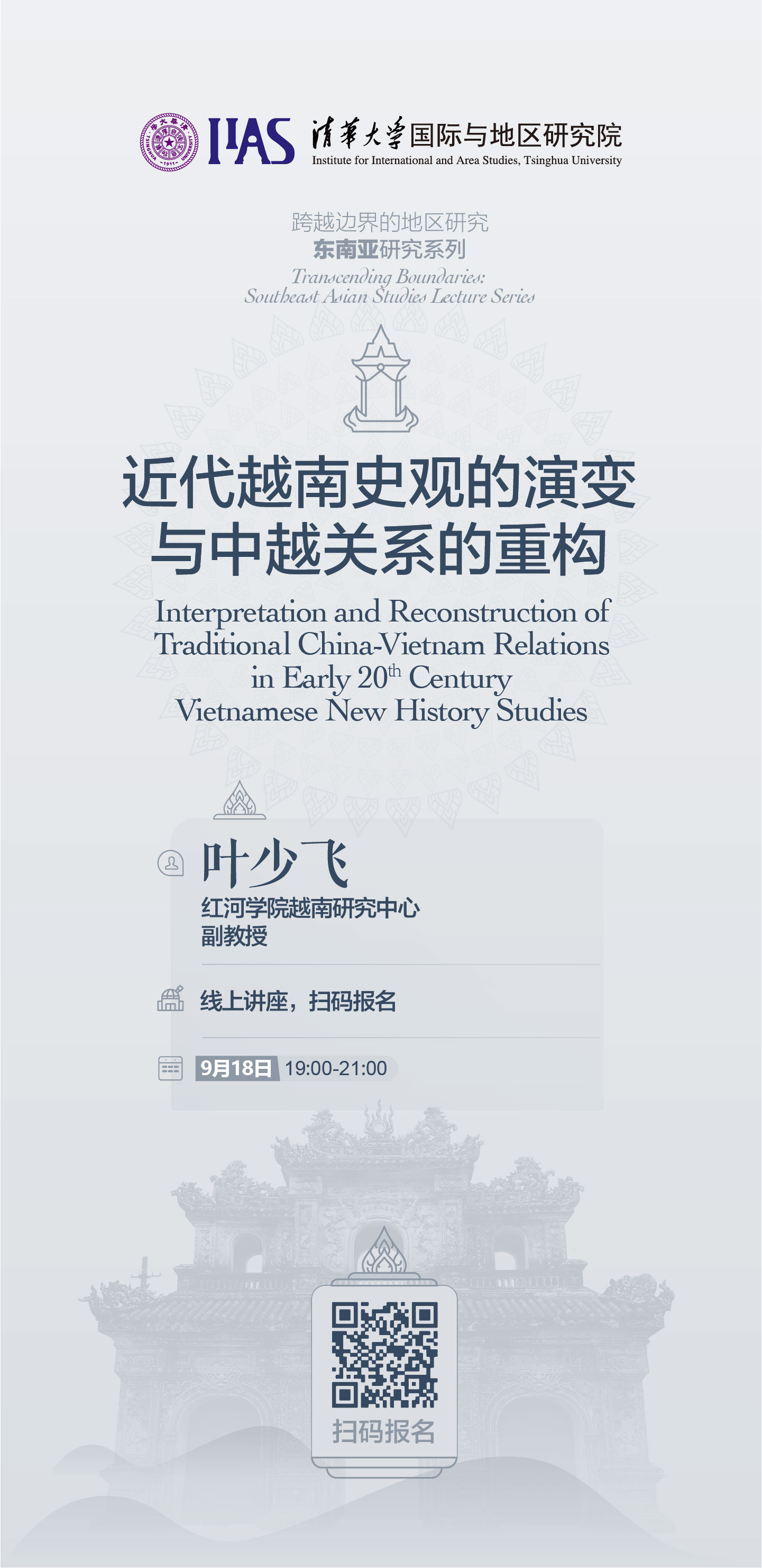 On the evening of September 18th, 2020, Prof. Ye Shaofei, Associate Professor at the Vietnam Research Center of Honghe University, gave an online lecture entitled “The Evolution of the View of Modern Vietnamese History and Reconstruction of Sino-Vietnamese Relations”, which is the first session in a series of lectures on “Area Studies Across the Boundaries: Southeast Asian Studies” by Institute of International and Area Studies, Tsinghua University (IIAS-THU). The audience consisted of the faculty and students from Tsinghua University, Peking University, Beijing Foreign Studies University, China Foreign Affairs University, Xiamen University, Guangxi Normal University and other institutions.