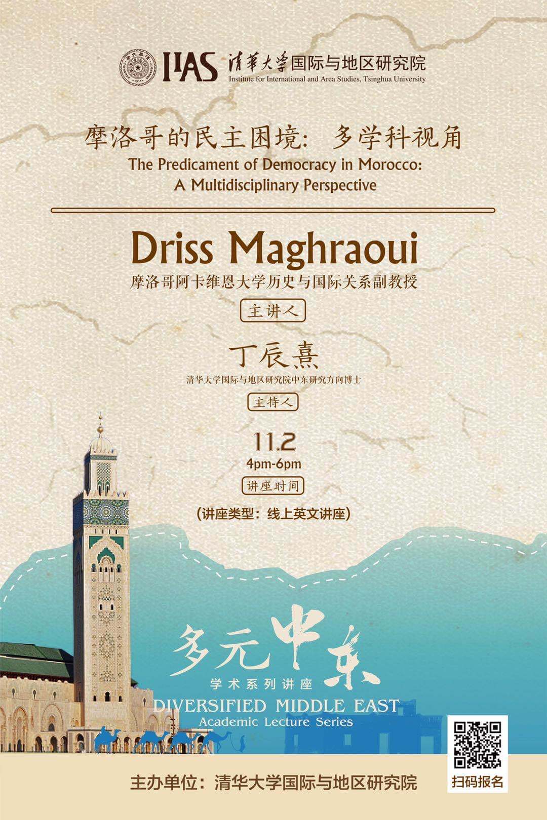 On the afternoon of November 2nd, 2020, Prof. Driss Maghraoui, Professor of Middle East Studies at Al Akhawayn University, conveyed an online lecture on the theme of “The Predicament of Democracy in Morocco: A Multidisciplinary Perspective” online for doctorate candidates at Institute of International and Area Studies, Tsinghua University (IIAS-THU) as well as scholars from and beyond IIAS. It is also the fourth session of “Pluralistic Middle East” Lecture Series hosted by IIAS. Ding Chenxi, a PhD in Law candidate of Tsinghua University, presided over the event.