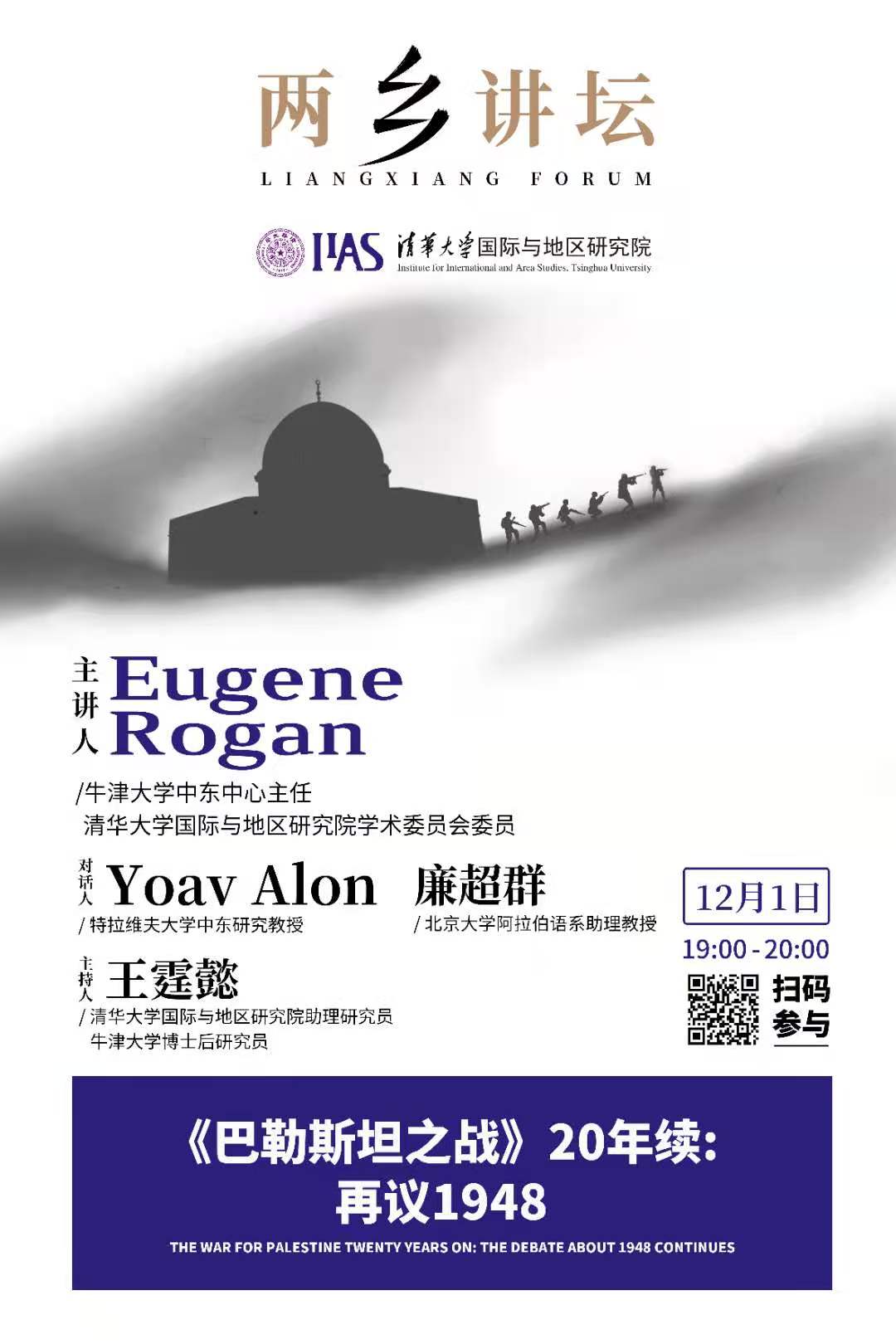 The Palestine issue is one of the most long-standing and complicated one in the Middle East. On the evening of December 1, 2020, Eugene Rogan, Professor of Modern Middle Eastern History at Oxford University and Director of the Middle East Center at St Antony’s College, University of Oxford, gave an online lecture entitled “The War for Palestine Twenty Years On: The Debate About 1948 Continues”. This lecture is the fifth of the “Liang Xiang” Forum, which is organized by Institute for International and Area Studies (IIAS), Tsinghua University. The lecture was also contributed by two interlocutors, and they are Yoav Alon, Professor of Middle East Studies at Tel Aviv University, and Lian Chaoqun, Assistant Professor in the Department of Arabic Language and Literature at Peking University, both of which had an interactive discussion with Professor Rogan in the second half of the lecture. Tingyi Wang, Assistant Professor of IIAS, Tsinghua University and the postdoctoral fellow at University of Oxford, hosted the lecture. Nearly 100 audiences from various institutions domestically and abroad, such as Tsinghua University, Peking University, Chinese Academy of Social Sciences, Beijing Foreign Studies University and Oxford University, attended the lecture.