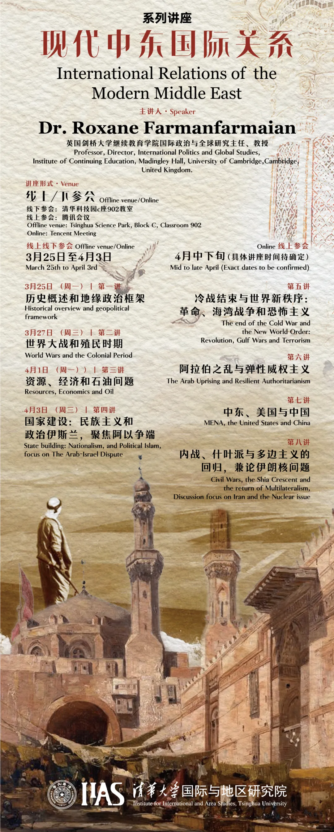 Roxane教授首先从现代中东和北非的历史概述和地缘政诒框架切入,讲述了该地区地缘政治、经济格局的形成及现状。第二讲阐释了两次世界大战及帝国主义在中东地区的影响,催生、助长了众多思潮和运动。第三讲则谈及中东北非地区的气候和环境变化,并分析了其经济发展的困境。紧接着在第四场讲座中,教授介绍了现代中东和北非政治格局的演变,分析了其民族主义的成因,并深入探讨阿以争端的形势。第五讲讨论了冷战结束后中东地区的历次战争,分析了中东地区力量格局的变化。第六讲则聚焦阿拉伯之春出现的原因与弹性威权主义。在第七讲中,教授深入探讨了中美与中东的密切关系,及两国在中东地区的影响。第八讲则着重分析了中东地区什叶派势力的分布情况,以及伊核问题所牵扯的利益各方。