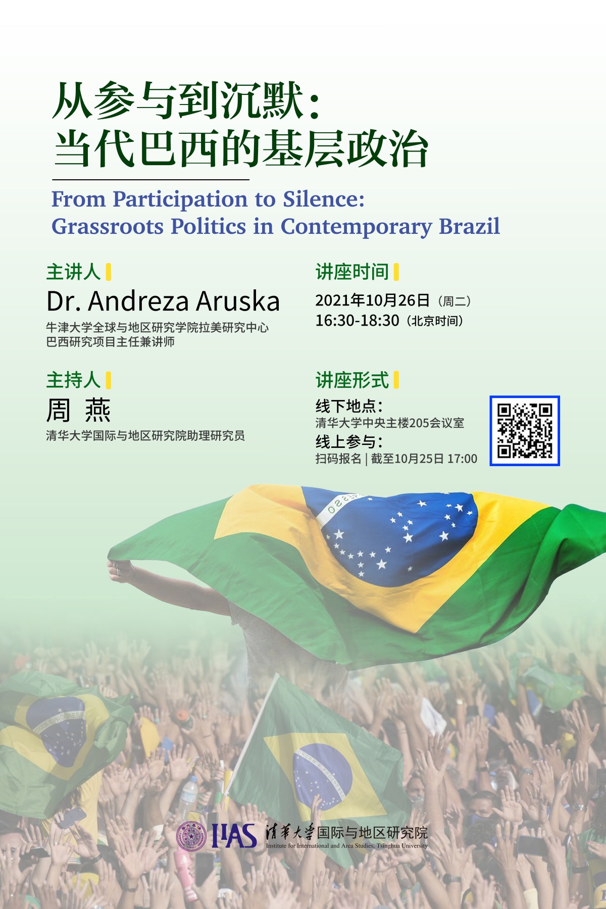 主办的2021年秋季学期第一场拉美和加勒比地区研究讲座顺利举办。本场讲座嘉宾是来自牛津大学的巴西研究项目主任Dr. Andreza Aruska,讲座围绕“从参与到沉默:当代巴西的基层政治(From Participation to Silence: Grassroots Politics in Contemporary Brazil)”的主题展开。本场讲座由h图书馆