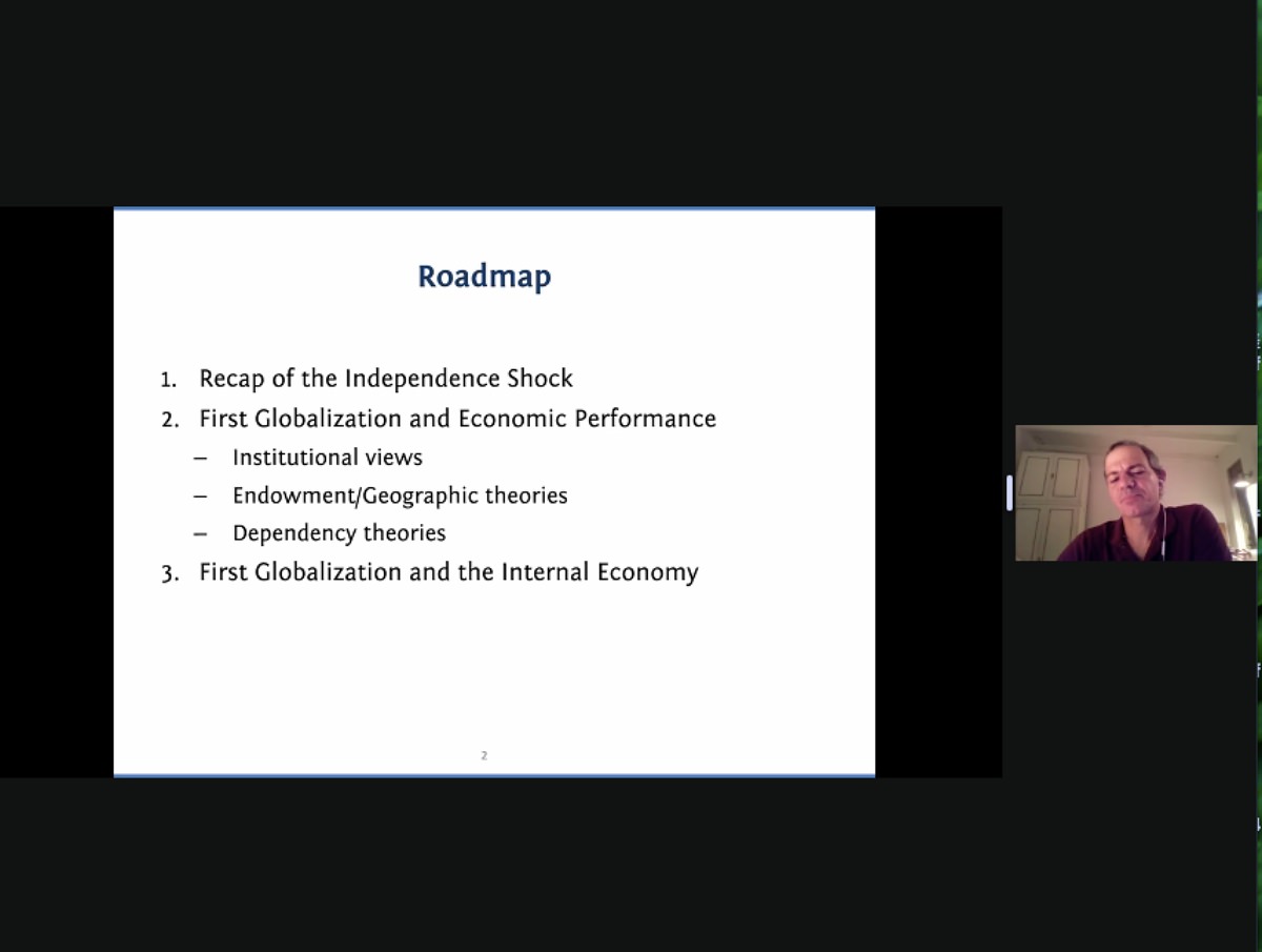 讲座伊始,拉齐教授向大家简要介绍了第四讲的授课思路。首先,拉齐教授带领听众们回顾拉丁美洲国家在争取民族独立之后所受到的影响,比如西班牙殖民时期延续的条款制度带来的负面束缚、国家进出口贸易条件变化造成的外部经济冲击、国家政体改变带来的政治动荡,还有因为国际国内交通成本变动带来的贸易变化等。接着,拉齐教授以巴西、墨西哥和阿根廷为例,具体指出拉美各国在后独立时代的经济表现异同。其中,他提到虽然巴西获得了独立,但是该国依旧保持着帝国主义的叙事色彩,巴西的奴隶制大种植园经济一直延续到19世纪末。而巴西的工业化之路也遇到了不少阻碍,包括缺乏技术和资本等发展现代化制造业的生产要素等。墨西哥独立后直到19世纪80年代都在遭受政治冲突和经济低速增长的困扰。对此,拉齐教授从西班牙殖民统治遗产的影响、土地使用分配制度问题和教会势力等多个角度尝试解释困扰的根源。阿根廷经济则在上述三个国家中相对更具有活力,但土地价格的普遍上涨和居民收入的相对减少,对阿根廷的生产和收入分配都产生了影响,使得该国一直在曲折中发展。然后,拉齐教授从制度主义、生产要素禀赋论和依附论等视角深刻地剖析在第一次全球化中拉丁美洲的经济表现。其中,拉齐教授与大家深入探讨了阿西莫格鲁和罗宾逊文章中的制度主义决定论的正确性,他认为学习了欧洲的制度并不意味着就能发展,拥有了精英并不意味着有建制,而是需要精英可以建立起一个完备和稳定的制度才能确保发展;从恩格曼和索科洛夫的生产要素禀赋论的角度来看,拉丁美洲的工业化进程同该地区的铁路交通条件息息相关;而从拉丁美洲学者提出的依附论看,拉丁美洲地区的政治独立并没有结束殖民时期形成的经济对外依赖性,外国公司依然掌控着国民经济的决定性行业。