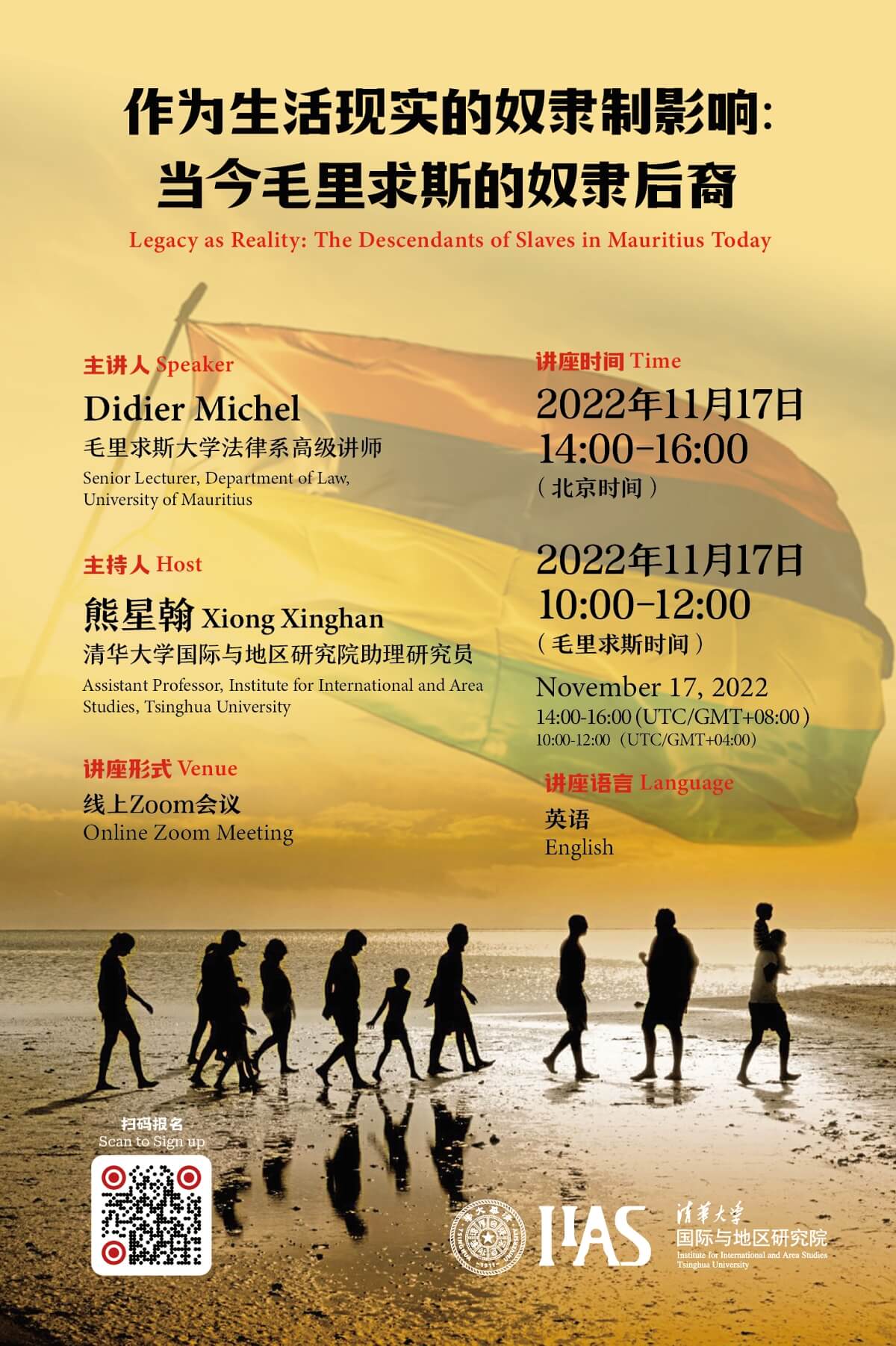 (以下简称“地区研究院”)撒哈拉以南非洲地区研究组2022-2023学年秋季学期第四讲在Zoom平台召开,主题为“作为生活现实的奴隶制影响:当今毛里求斯的奴隶后裔”(Legacy as Reality: The Descendants of Slaves in Mauritius Today)。本次讲座由毛里求斯大学法律系系主任迪迪埃·米歇尔(Didier Michel)主讲,h图书馆