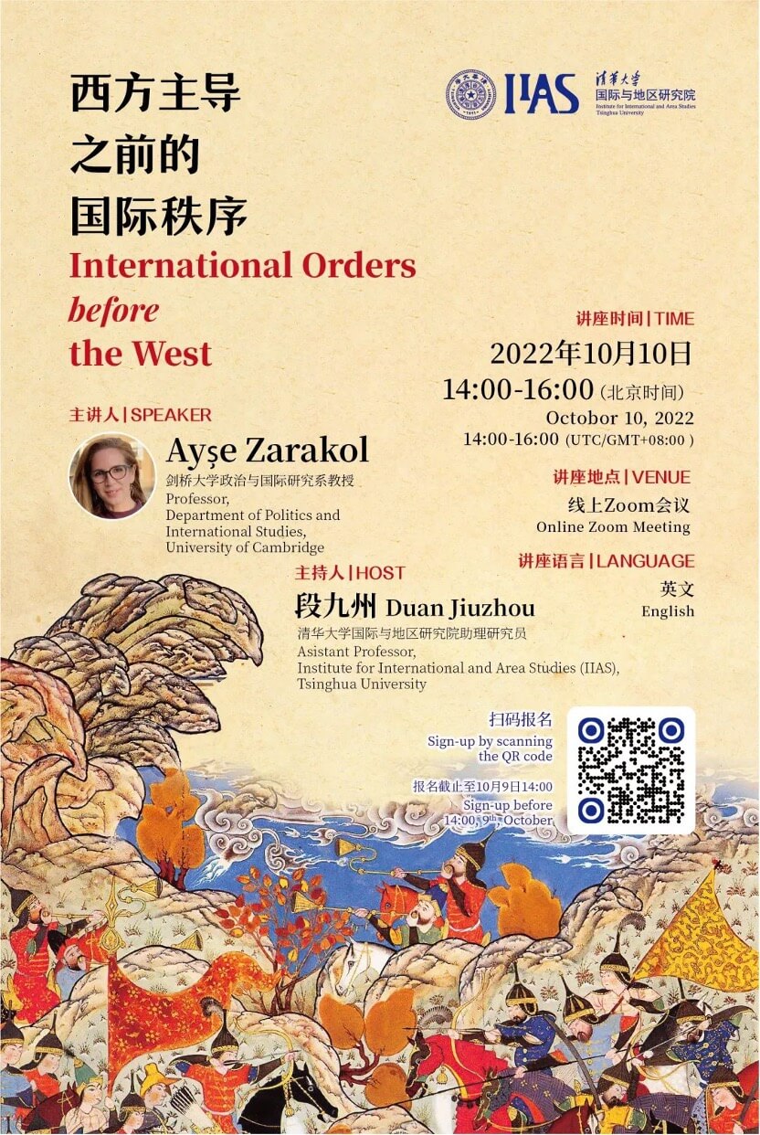 本次讲座分为两个部分。在第一部分,Ayşe Zarakol教授向观众介绍了她的新著Before the West: The Rise and Fall of Eastern World Orders。本书旨在通过研究蒙古帝国、帖木儿帝国、明帝国、萨法维帝国、奥斯曼帝国、莫卧儿帝国等东方帝国所主导的一系列“欧亚国际秩序”,构建出一种去欧洲中心化的国际秩序史叙述范式。Zarakol教授指出,传统欧洲中心主义的国际秩序史对于威斯特伐利亚体系出现之前欧亚地区长期忽视,并错误地认为欧洲以外各地区之间的交流极其有限。这种国际秩序史叙述方式越发难以帮助当今的人们理解世界秩序及其兴衰的原理。而本书的研究,则有益地填补了这一缺陷,通过展现一系列 “欧亚国际秩序”兴衰史,作者得以阐释这些非西方的国际秩序如何推动了欧亚各地区之间的物质资源交换,并塑造了某种被欧亚各地区共同推崇的“普世”政权组织模式、统治模式和政治文化。
