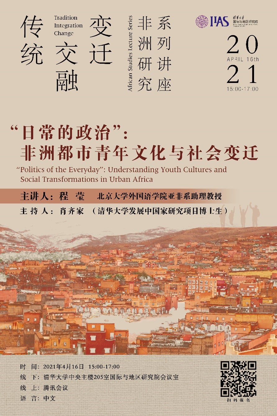 2021年4月16日下午,非洲研究系列讲座:传统、交融与变迁第二讲在中央主楼205会议室召开,主题为“日常的政治”:非洲都市青年文化与社会变迁。本次讲座由北京大学外国语学院亚非系助理教授程莹主讲,地区研究院博士生及研究人员参与了线下现场讲座,部分校外学生学者参加了线上讲座。