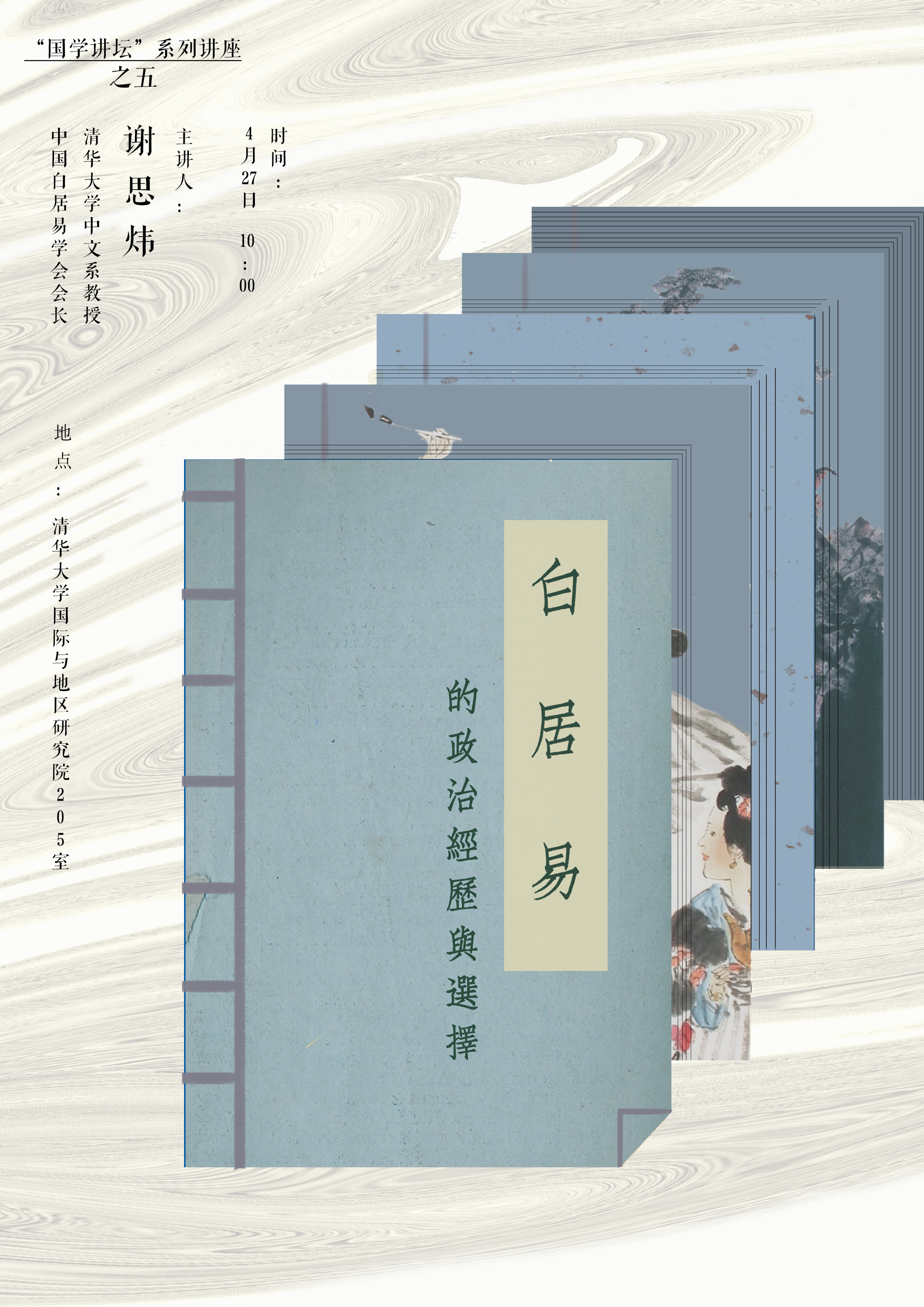 中文系教授谢思炜主讲,主题为“白居易的政治经历与选择”。谢思炜老师从自身接触白居易的经历开始讲起,引出讲座题目的由来。