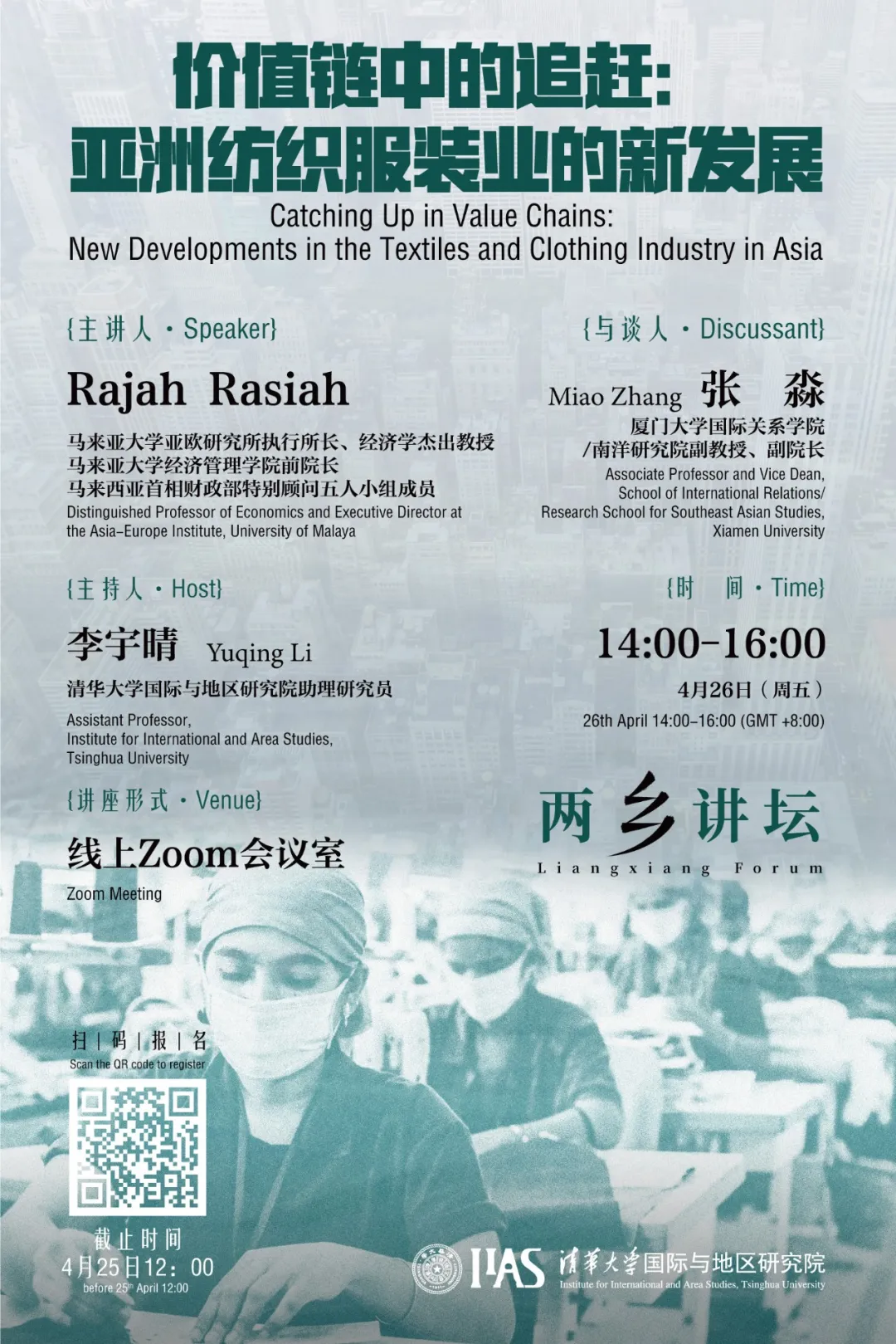 “两乡讲坛”第二十六讲线上开讲,主题为“价值链中的追赶:亚洲纺织服装业的新发展”(Catching Up in Value Chains: New Developments in the Textiles and Clothing Industry in Asia)。本场讲座由马来亚大学亚欧研究所执行所长、经济学杰出教授,经济管理学院前院长,马来西亚首相财政部特别顾问五人小组成员Rajah Rasiah主讲,厦门大学国际关系学院/南洋研究院副院长张淼与谈,h图书馆