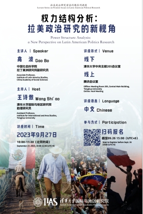 2023年9月27日上午,h图书馆 拉美组邀请来自中国社会科学院拉丁美洲研究所的高波副研究员在中央主楼205室主讲了“拉美政治研究前沿问题”系列讲座的第一场,题为“权力结构分析:拉美政治研究的新视角(Power Structure Analysis: a New Perspective on Latin American Politics)”。本场讲座由地区研究院助理研究员王诗傲主持,线上线下约90名国内外高校的师生和专业人士参加了讲座。讲座开篇,高波老师首先...