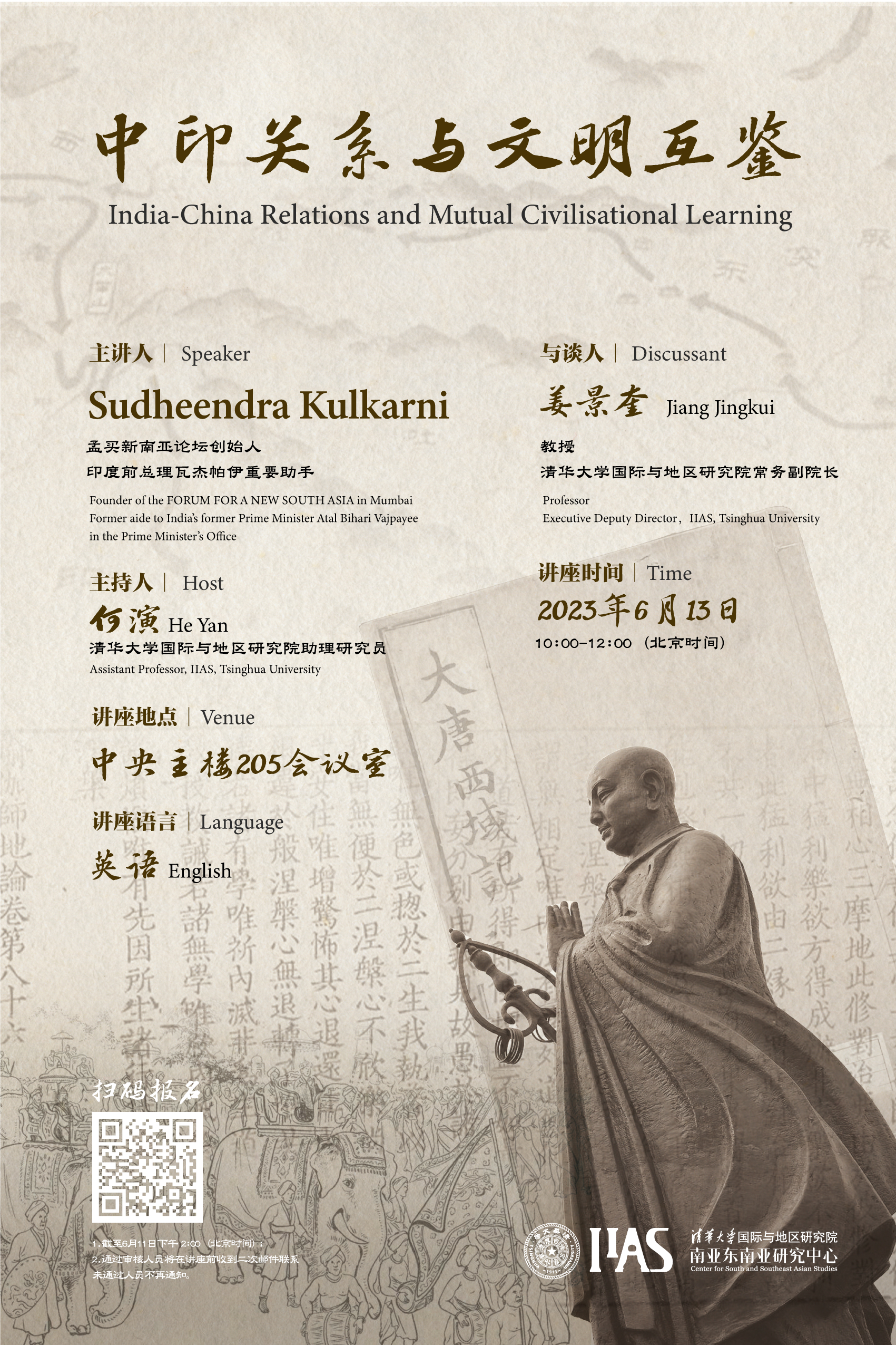 2023年6月13日上午,印度知名学者、孟买新南亚论坛创始人、印度前总理瓦杰帕伊重要助手苏廷德拉· 库尔卡尼(Sudheendra Kulkarni)先生在h图书馆 与校内外师生开展了主题为“中印关系与文明互鉴”(India-China Relations and Mutual Civilisational Learning)的学术座谈会。地区研究院常务副院长、南亚东南亚研究中心主任姜景奎教授参加与谈,座谈会由地区研究院助理研究员何演主持。座谈会伊始,库尔卡尼先...