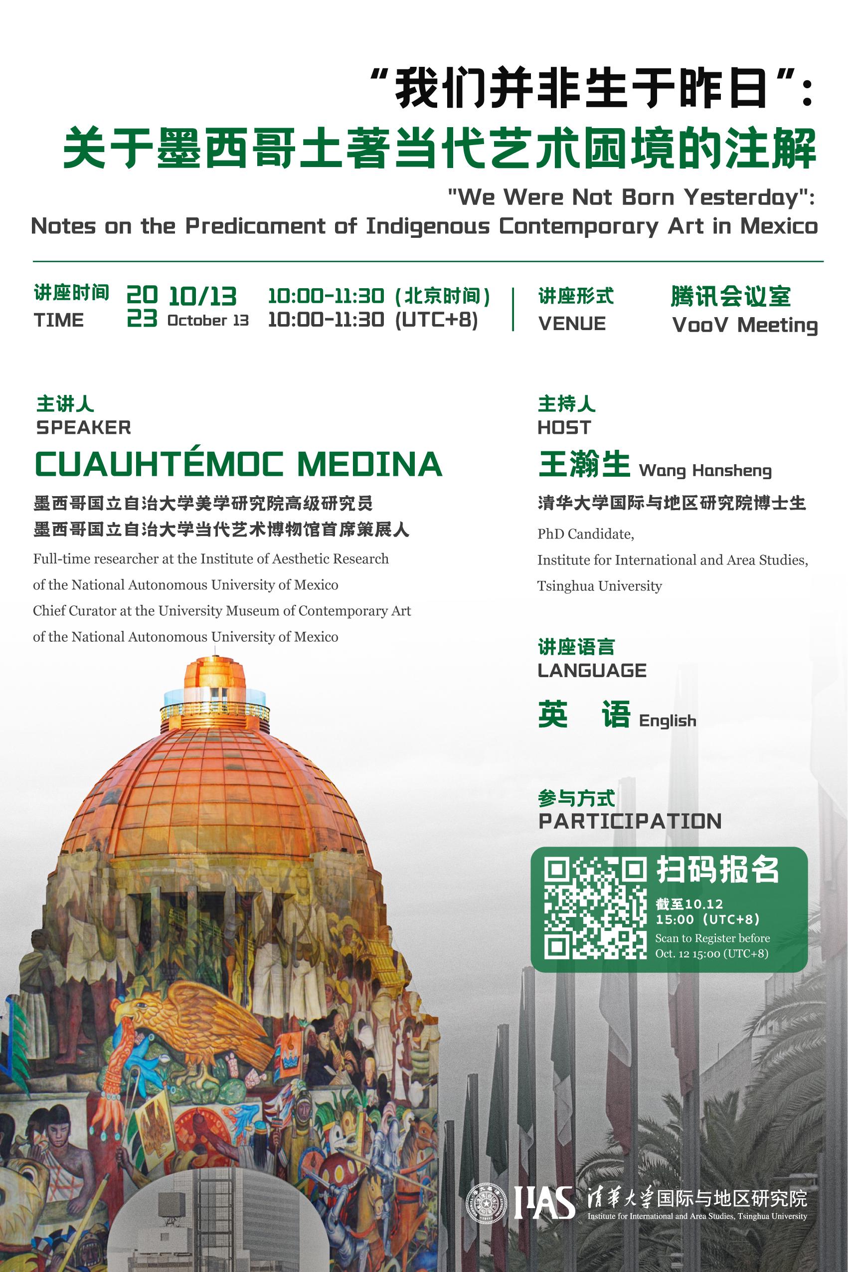 2023年10月13日上午,h图书馆 邀请墨西哥知名艺术史家、国立自治大学美学研究院研究员、大学当代艺术博物馆首席策展人Cuauhtémoc Medina博士举行了一场主题为“‘我们并非生于昨日’:关于墨西哥土著当代艺术困境的注解”的线上学术讲座。本场讲座由地区研究院博士生王瀚生主持,国内外高校师生及对议题感兴趣的相关人士参加了本场讲座。在讲座中,Medina老师从艺术和历史的视角考察了墨西哥的土著主义问题。他...