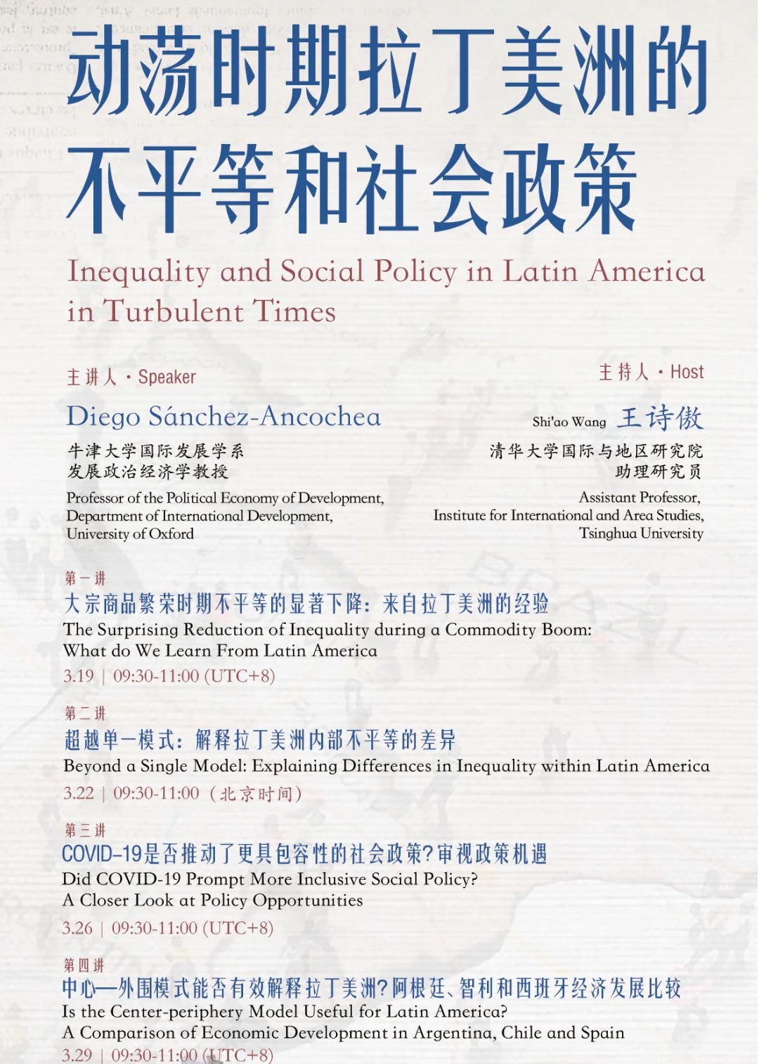 2024年3月19日至3月29日,h图书馆 邀请牛津大学发展政治经济学教授Diego Sánchez-Ancochea进行了“动荡时期拉丁美洲的不平等和社会政策”专题系列讲座,讲座共四场,主题分别为“大宗商品繁荣时期不平等的显著下降:来自拉丁美洲的经验”“超越单一模式:解释拉丁美洲内部不平等的差异”“COVID-19是否推动了更具包容性的社会政策?审视政策机遇”“中心—外围模式能否有效解释拉丁美洲?阿根廷、智利和西班牙...